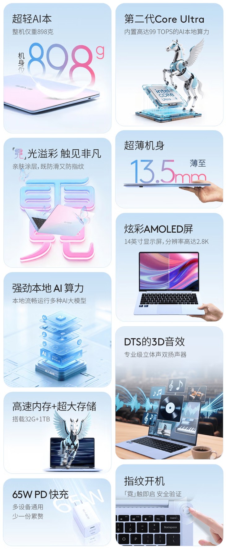 性能方面,该笔记本聚焦于轻薄便携与高性能的融合。它搭载了第二代英特尔酷睿Ultra处理器,为用户提供Ultra 5-225H和性能更强劲的Ultra 9 285H两种配置可选,后者最高主频可达5.4GHz。同时,它集成了英特尔Arc GPU,足以保障日常办公、应对创意设计乃至轻度游戏。尤为突出的是,该机内置高达99 TOPS的本地AI算力,能够流畅运行多种AI大模型,为用户赋予强大的智能体验。全系机型均标配32GB LPDDR5x 8533MHz高速内存和1TB PCIe 4.0 SSD,确保多任务切换顺滑且存储空间充足。