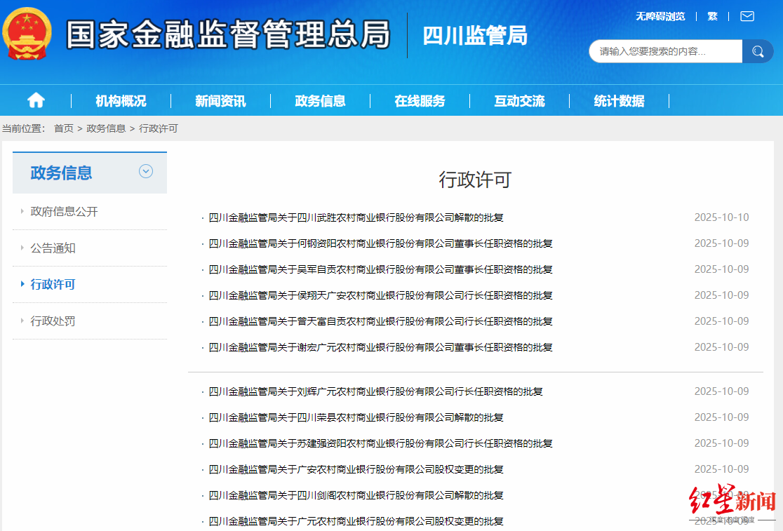 微成都报道 10月9日至10日,四川金融监管局发布多则批复,批准荣县农商行、广安思源农商行等13家县级农村商业银行因被吸收合并而解散,其业务将分别由自贡、广元、广安、资阳四家市级农商银行承继。