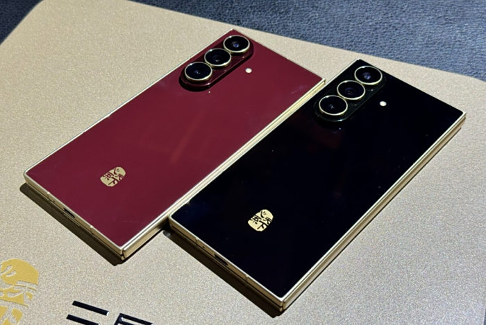 作为新品的一大亮点,三星W26带来了丹曦红与玄曜黑两种配色,极富东方美学,搭配中框、摄像头环镶嵌的金色更显得尊贵奢华。
