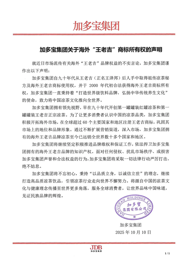 10月10日,加多宝集团发布关于海外“王老吉”商标所有权的声明,声称拥有王老吉海外商标所有权。