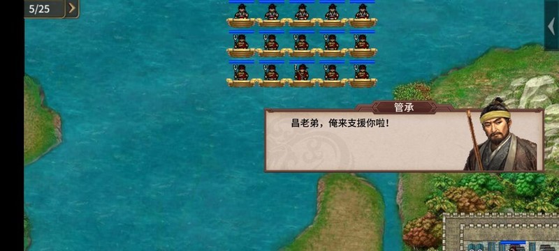 开局先给程昱使用身轻如燕提升移速,熟悉水性后向前推进,其余人分两侧上岸撤离。