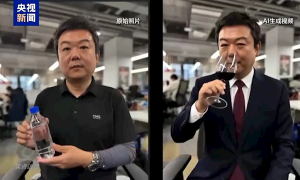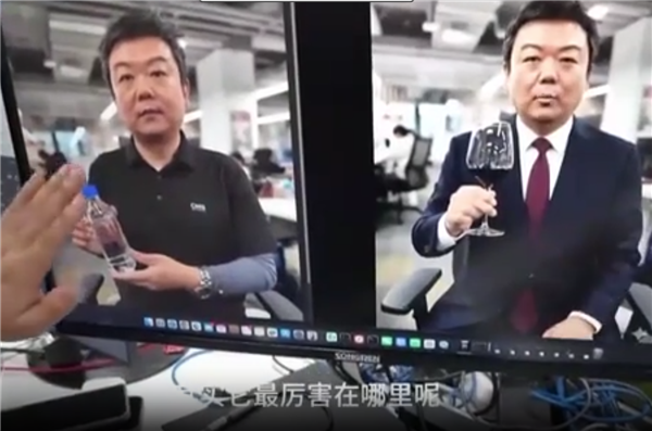 记者体验了一下,用一张照片生成一段带货视频。短短几分钟的时间,记者手里的矿泉水就变成了红酒,身上穿的T恤衫就变成了西服,还实现了纯正的英文带货推销。