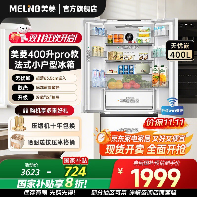 美菱400升超薄零嵌冰箱到手仅1999元