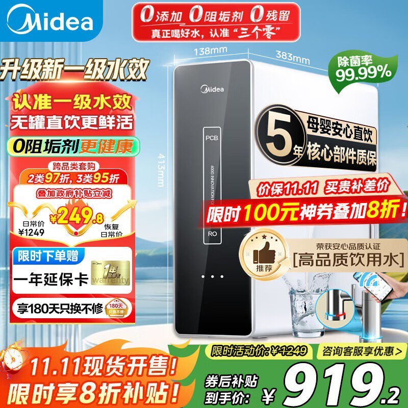 美的麒麟 MRO1891A - 400G 纯水机低至 919.2 元