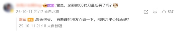 11日,有网友在社交平台追问:“雷总,您那8000的刀最后买了吗?”雷军直接回复:“没舍得买。有新疆的朋友介绍一下,那把刀多少钱合理?”