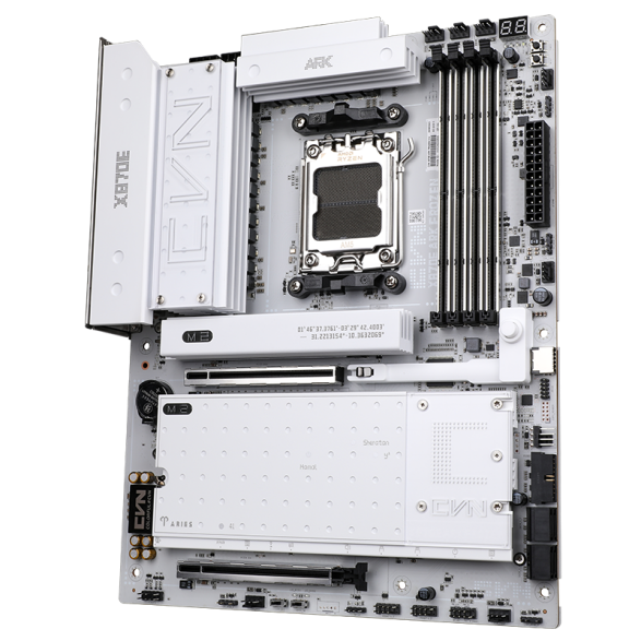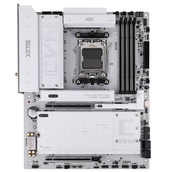 CVN X870E ARK FROZEN V14支持AM5插槽的AMD锐龙7000、8000和9000系列处理器,并可支持192GB的DDR5内存,内存速度最高可达8200 MT/s(超频),同时兼容EXPO和XMP配置文件。