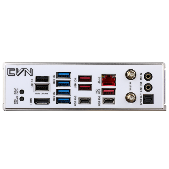 这款主板采用了白色PCB,配备CVN寒霜散热装甲,并配备了全尺寸金属背板。