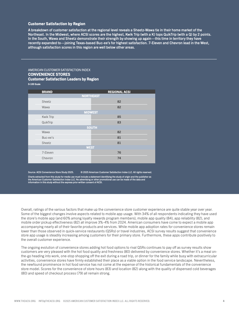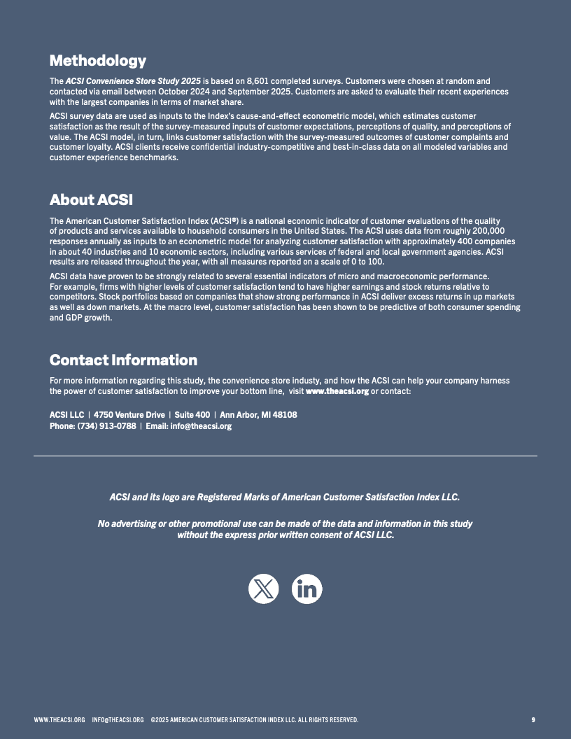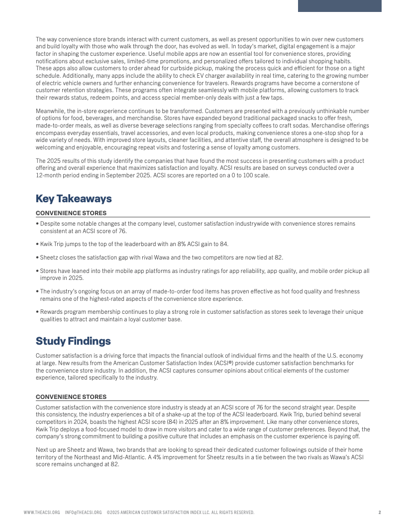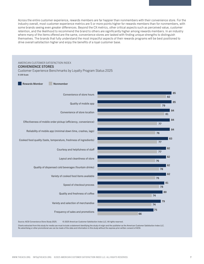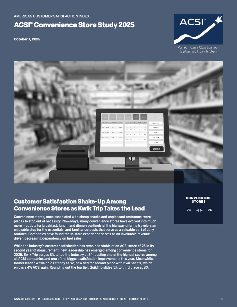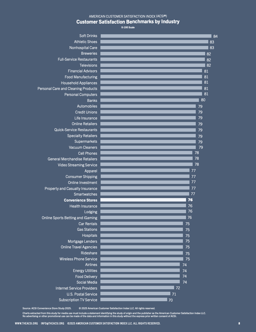 2025年美国便利店客户满意度报告揭示了行业内消费者体验的最新变化和趋势。总体来看,便利店客户满意度指数维持在较高水平,但不同连锁品牌间满意度出现显著分化。顶尖品牌通过改善店内环境、商品多样性及结账效率赢得顾客青睐,满意度指数处于80以上的高位区间,而表现较弱的品牌则明显落后,得分接近75。