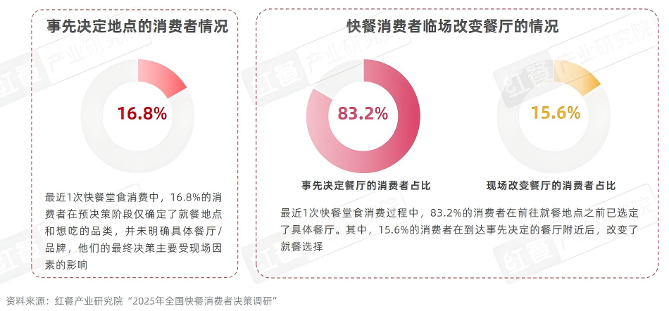 红餐产业研究院“2025年全国快餐消费者决策调研”显示,最近1次快餐堂食消费中,83.2%的消费者在预决策阶段已选定了具体餐厅,其中,15.6%的消费者在到达事先决定的餐厅附近后,改变了就餐选择。