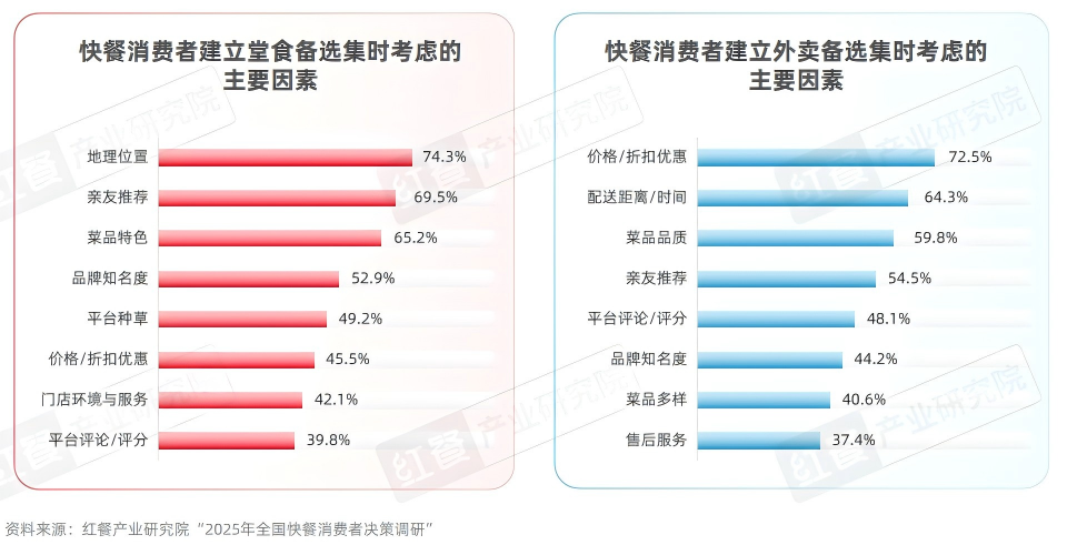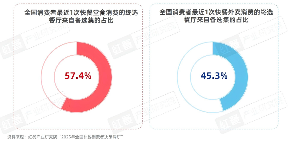 值得注意的是,即便品牌成功进入消费者的快餐备选集,也未必能确保其成为最终的消费选择。红餐产业研究院“2025年全国快餐消费者决策调研”显示,在最近1次快餐堂食消费中,57.4%的消费者最终就餐的餐厅是来自其备选集;而在最近1次快餐外卖消费中,仅有45.3%的消费者最终下单餐厅是来自其备选集。