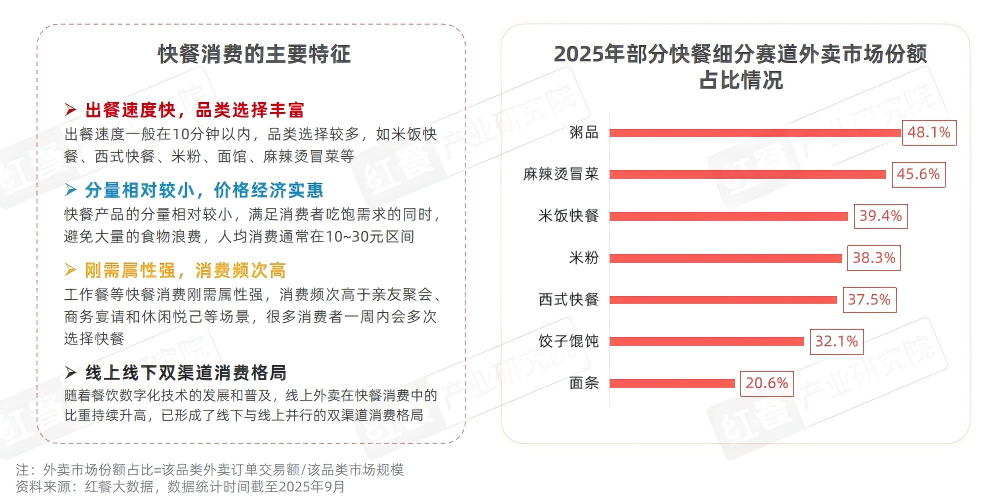 此外,随着近年来餐饮数字化技术的发展和普及,线上外卖在快餐消费中的比重持续升高,已形成了线下与线上并行的双渠道消费格局。红餐大数据显示,截至2025年9月,粥品和麻辣烫/冒菜的外卖市场份额占比已超过了四成,米饭快餐、米粉、西式快餐和饺子馄饨的外卖市场份额占比则均超过了三成。