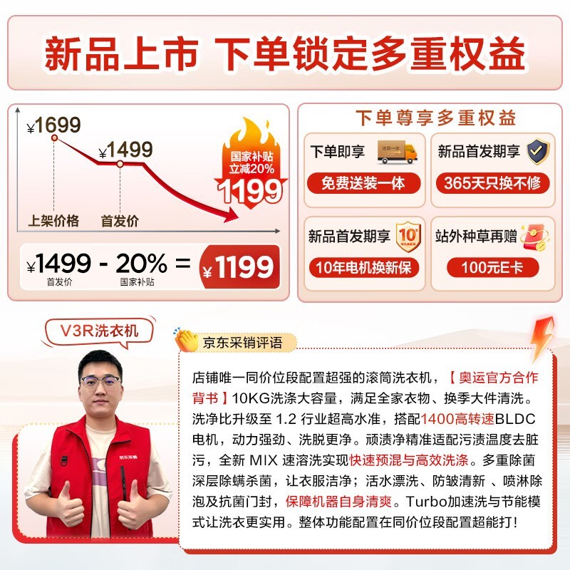TCL超旋风V3R洗衣机直降到手1190元