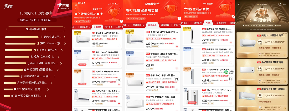 市场数据也印证了这一点,奥维云网(AVC)统计显示,约42%的消费者表示,愿意为“长期节省电费”而选择更节能的产品。节能、健康、智能互联已成为驱动产品换新的三大核心诉求。这意味着,一台好空调的标准,已从基础制冷制热,升级为一项关乎未来数年生活品质与成本的“长期投资”。这一趋势在销售端尤为明显,今年双十一京东首开28小时,美的空调整体销售额爆发,其中“酷省电”系列在“2 匹 + 挂机累计榜”、“净化除菌空调热卖榜”、“大三匹挂机空调热卖榜”等多榜单销量登顶,成为当之无愧的“消费风向标”。