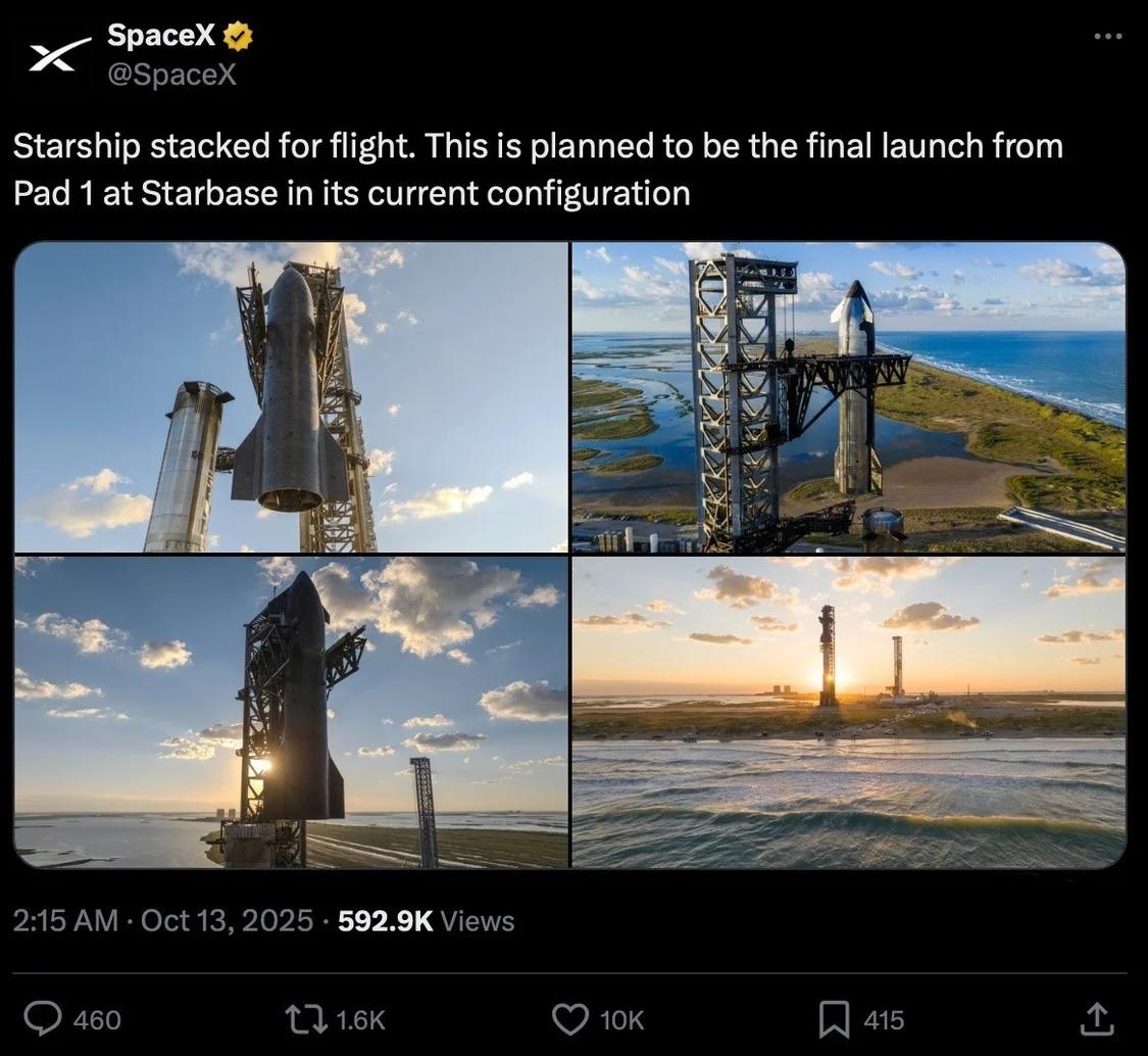 参考马斯克发布的最新现场照片,本次飞行也是 Starbase 发射台 1 在现有配置规格下的最后一次使用。之后该发射台将进行大幅升级改造,以支持更高规格的星舰 V3 与后续型号发射。