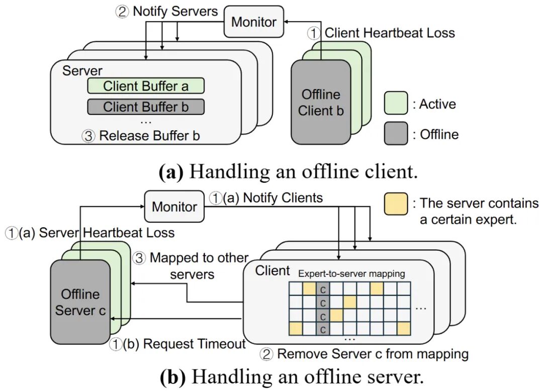 容错与故障恢复机制:EaaS 通过客户端 - 服务端的松耦合通信取代了集体通信,天然具备更强的容错性。系统设置了一个中央监控组件,实时追踪各实例健康状态。当某个专家服务发生故障停止响应时,通知相关的 Attention 客户端自动切换到该专家的其他可用实例继续服务,无需重建全局通信组。同样地,如果某个 Attention 客户端节点故障,其他客户端不会直接中断,新客户端加入也不会扰乱正在运行的专家服务。