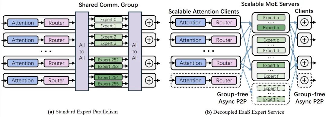 专家服务化、无状态设计:EaaS 将每个专家拆分成独立服务模块,专家不维护会话状态,仅根据请求计算输出。Attention 层(客户端)通过 gating 动态选取需要调用的专家服务。由于专家之间相互独立,整个模型不再是一个庞大的紧耦合应用,而是由许多可独立扩展的服务组成,为精细扩展奠定基础。在这种架构下,模型初始部署规模可以很小(例如 16 块 GPU 起步),可以一次增加 / 减少一块 GPU 来精确匹配负载需求。