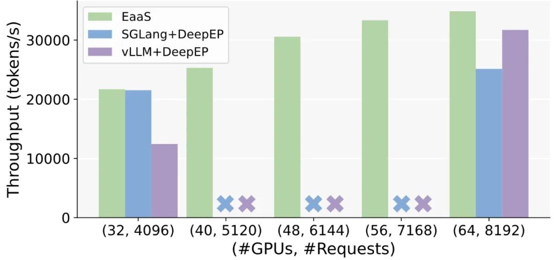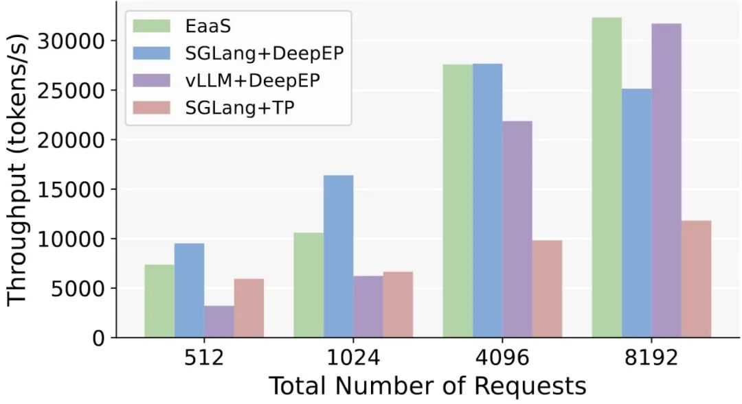 论文通过一系列大规模实验,利用端到端的 benchmark 对比了 EaaS 与当前主流 MoE 推理方案(如 SGLang + DeepEP、vLLM + DeepEP 以及 SGLang + TP 等组合)的性能,在扩展性和容错等方面展现出 EaaS 的优势。