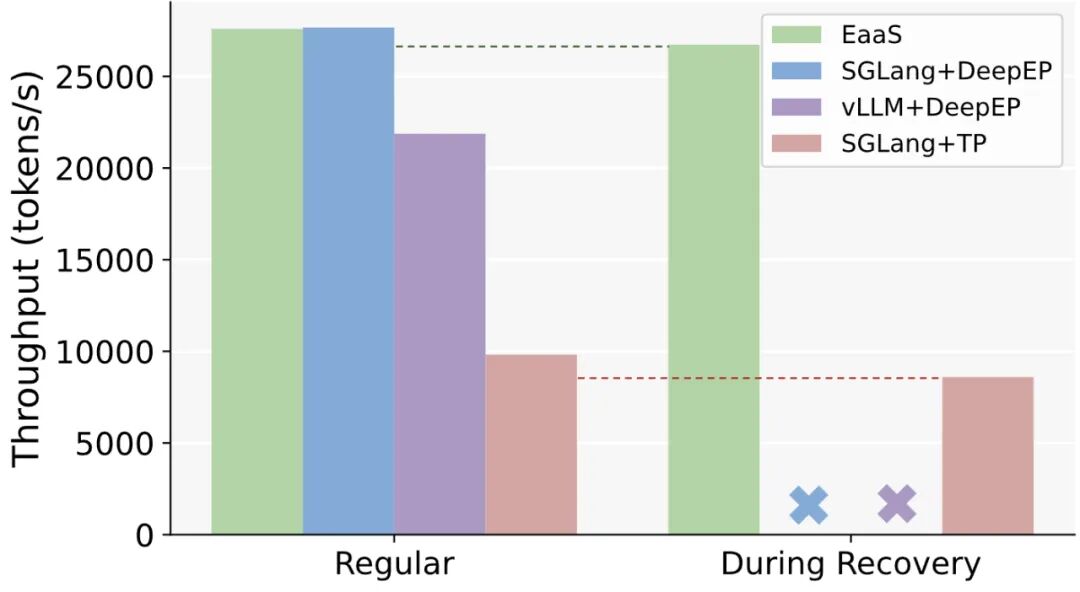 容错与鲁棒性:在模拟故障场景中,EaaS 展现出卓越的服务连续性。当实验中随机失效 GPU 节点时,EaaS 几乎不中断地完成了请求处理,吞吐量仅略微下降不到 2%。相比之下,采用 DeepEP 等传统方案的系统由于所有解码 GPU 绑定在单一通信组内,任一节点故障都会使整个组停止服务,无法在故障期间继续推理。EaaS 中有故障的专家请求被即时路由到备用副本处理,客户端自身故障也被其他实例接管,整个服务保持了高可用性。