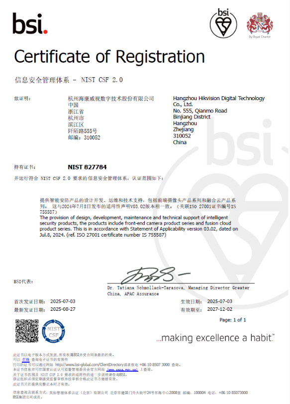 近日,海康威视成功通过NIST CSF网络安全框架2.0版本的认证,经过全球权威标准组织——英国标准协会(BSI)多轮严格审核,成为国内首个获得NIST CSF 2.0认证的公司。这一认证标志着海康威视在网络安全治理、风险管理和合规对标方面达到了国际先进水平。