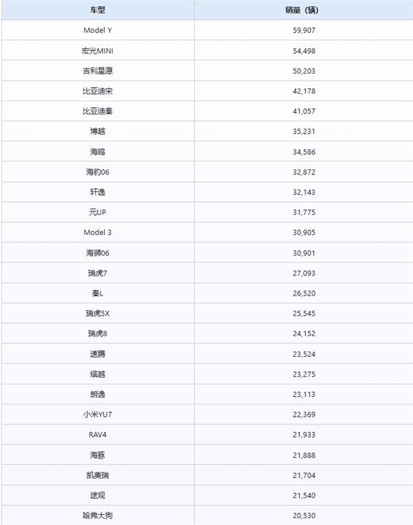 位列Model Y之后的是宏光MINI(54498辆)与吉利星愿(50203辆),二者销量均突破5万辆,分别占据榜单第二、三位。