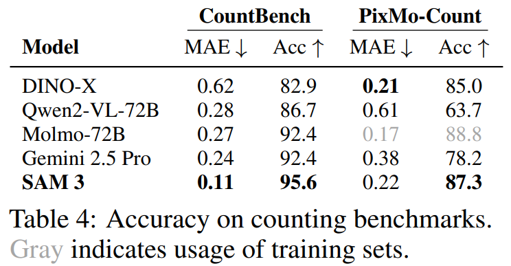 物体计数。结果如表 4 所示,与 MLLM 相比,SAM 3 不仅实现了良好的物体计数准确率,而且还提供了大多数 MLLM 无法提供的对象分割功能。