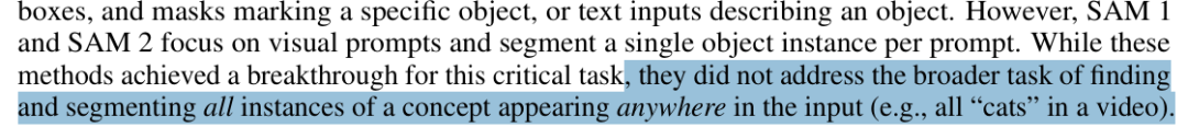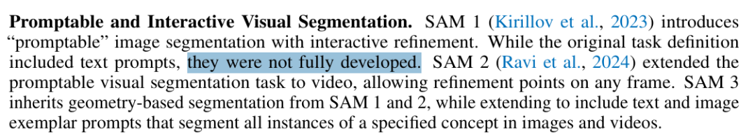 论文中明确指出,在 SAM 1 中,文本提示的功能「没有被完全开发」(were not fully developed)。SAM 1 和 SAM 2 的实际重点在于视觉提示(如点、框、掩码)。