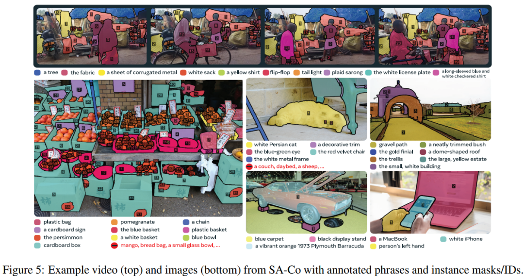更进一步的,本文还创建了用于 PCS 任务的 Segment Anything with Concepts(SA-Co)基准测试,涵盖 124K 张图像和 1.7K 视频中的 214K 独特概念,其概念数量超过现有基准测试集 50 倍以上。