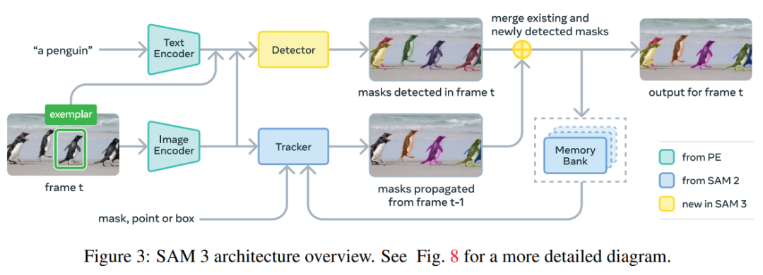 在模型架构上,SAM 3 采用双编码器 - 解码器 Transformer 架构,这是一个具有图像级识别能力的检测器 —— 通过与跟踪器和内存模块相结合,可应用于视频领域。检测器和跟踪器通过对齐的感知编码器(PE)主干网络接收视觉 - 语言输入。