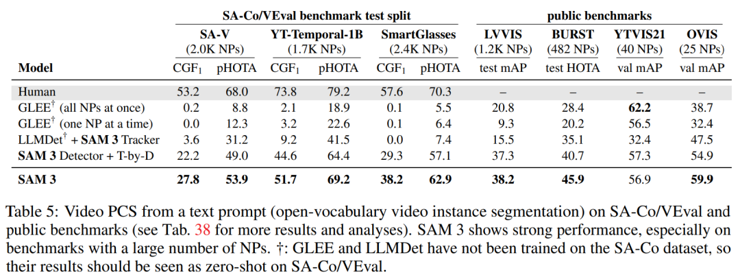 SAM 3 在文本提示下的视频分割表现。结果显示 SAM 3 的表现远超基线,尤其是在包含大量名词短语的基准测试中。