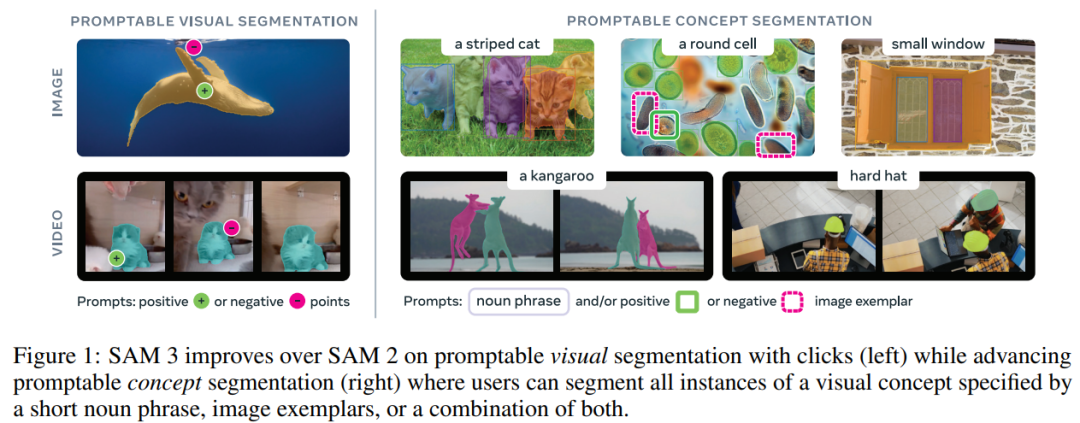 文中提到,SAM 3 是对 SAM 2 的扩展,其在图像与视频中实现了可提示分割(promptable segmentation)的重大突破。