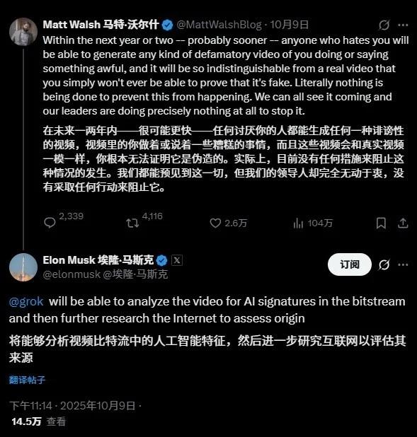 对此,马斯克回应称,Grok 即将推出一项新功能。他写道:“@grok 将能够分析视频比特流中的人工智能特征,并进一步搜索互联网以评估其来源。”