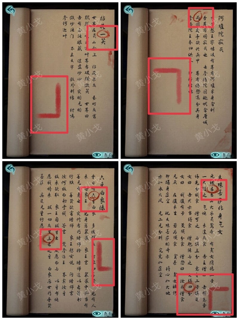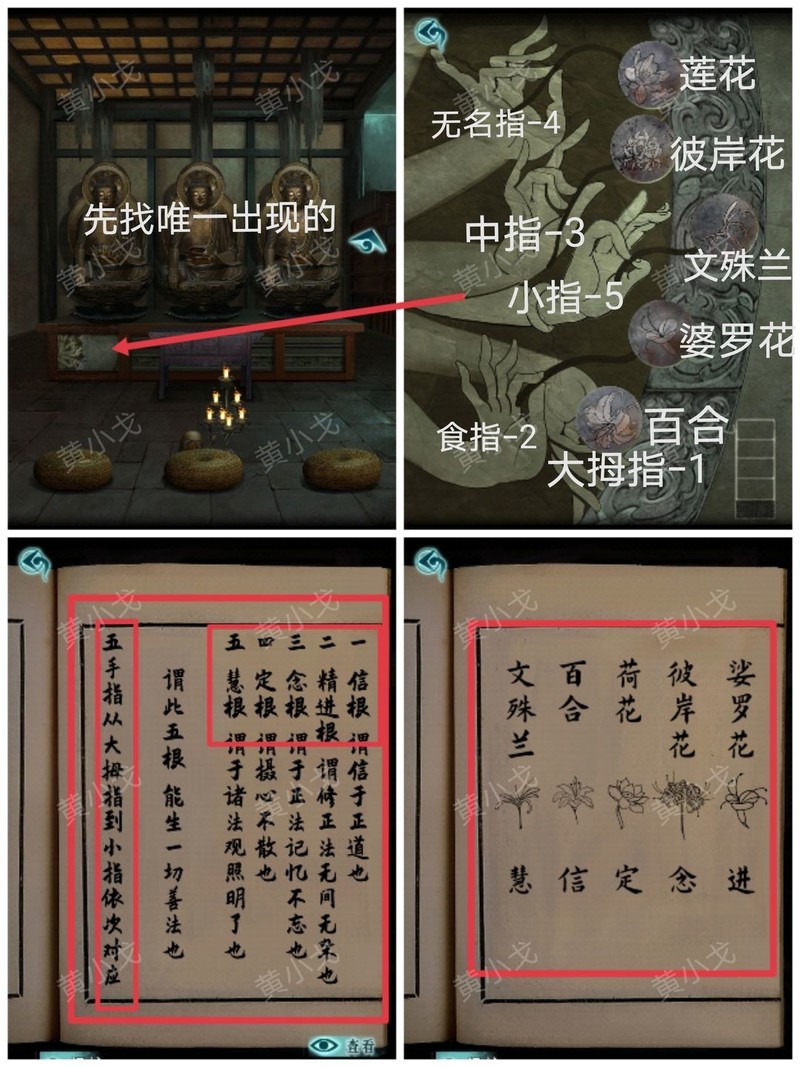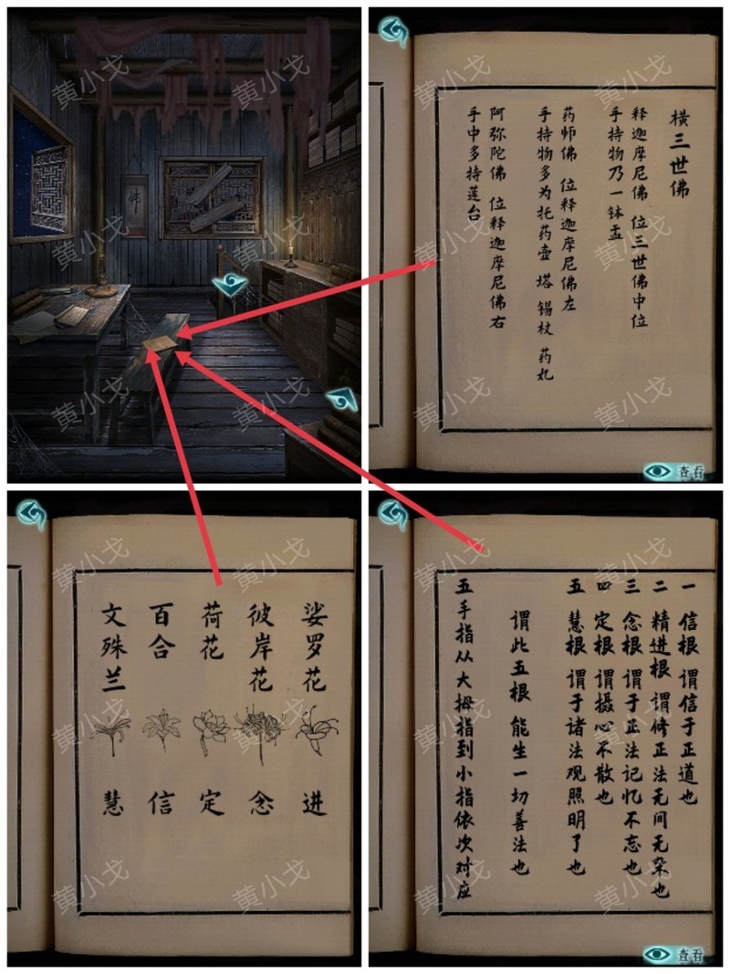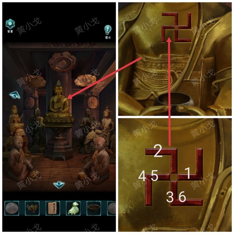 点击中间释迦牟尼佛像胸口印记,依照三楼书上的提示,按顺序点击对应印记(右下、右上、左下、左上、左上、左下)。