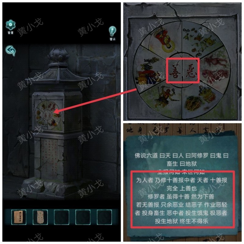 点击上方善恶石盘机关,依照竹简提示正确安放对应石块。
