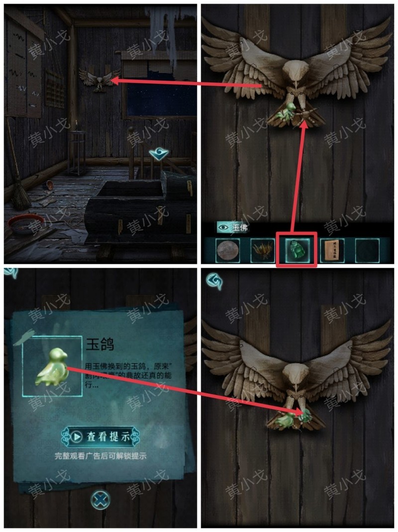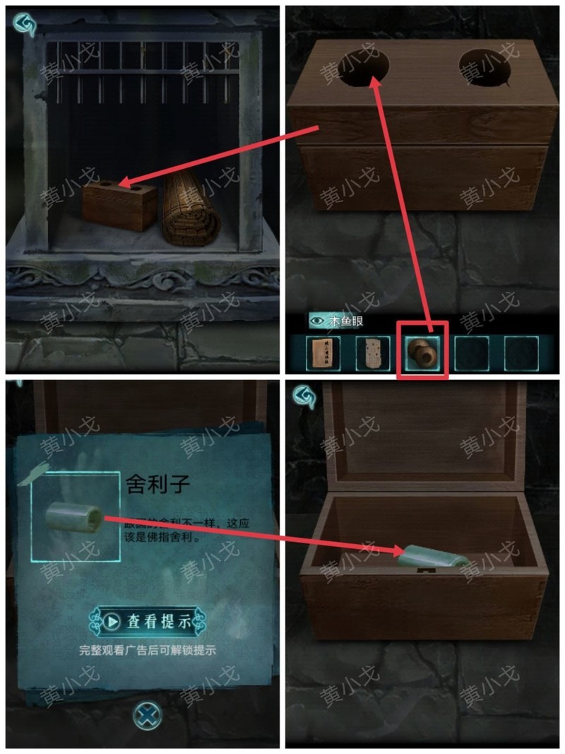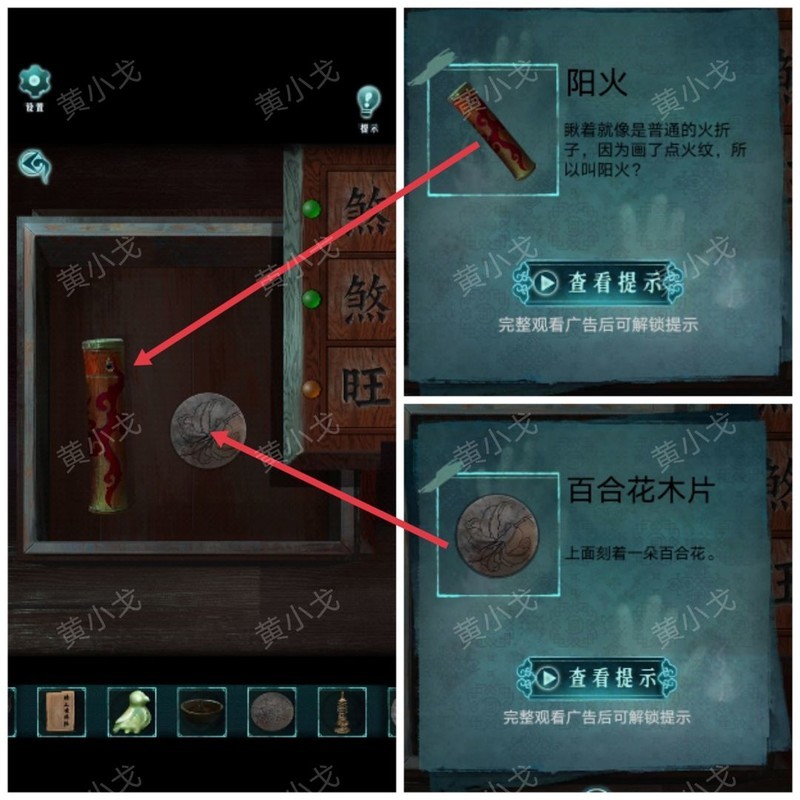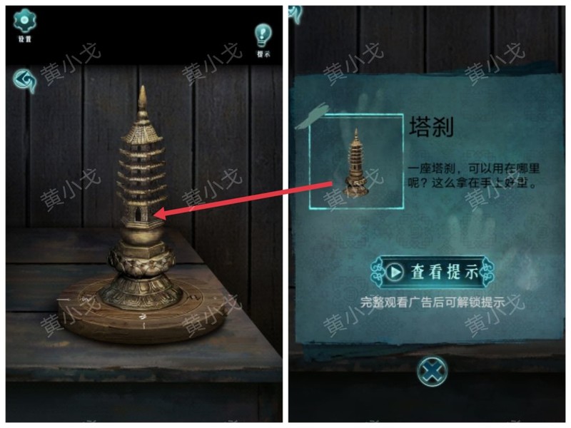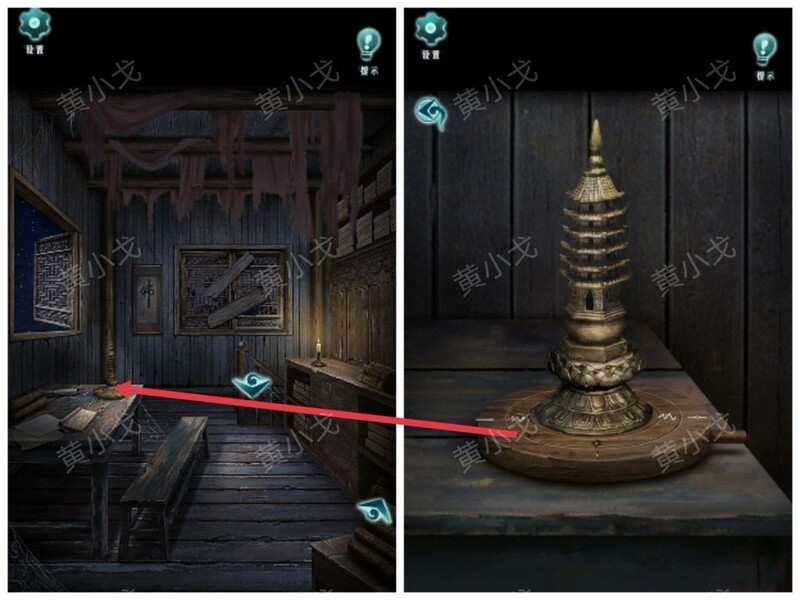 点击三楼桌上的塔刹,依据竹帘提示调整机关。