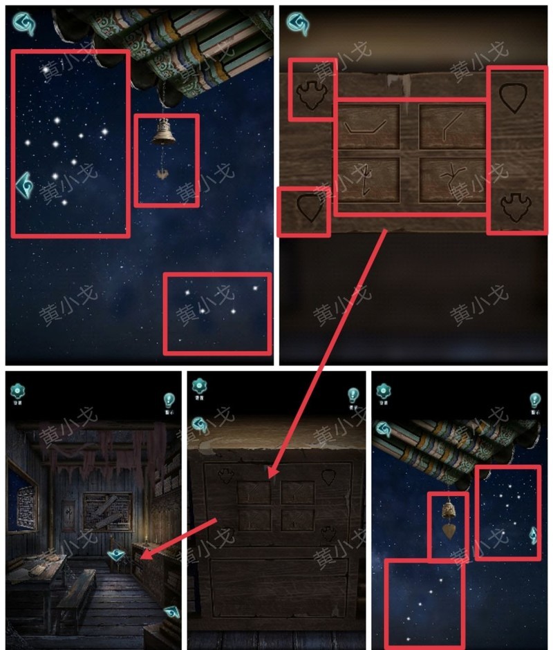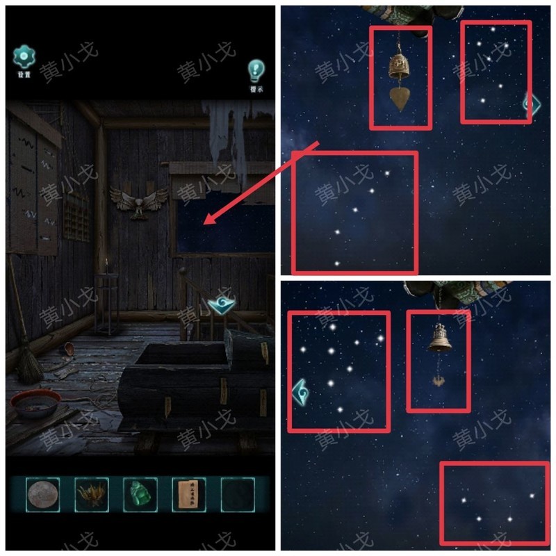 点击柜子上的机关,根据图案提示,结合顶楼窗外的线索,调整铃铛样式和对应的星星图案。