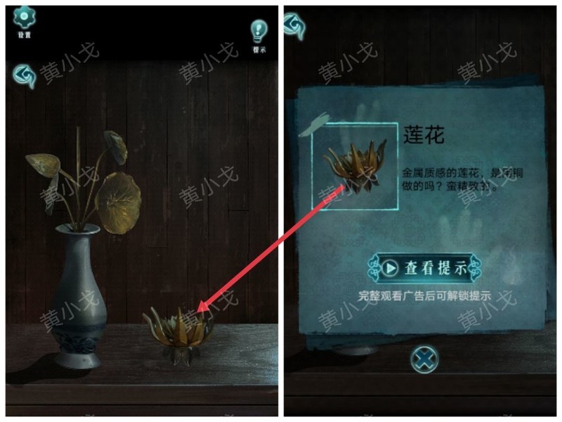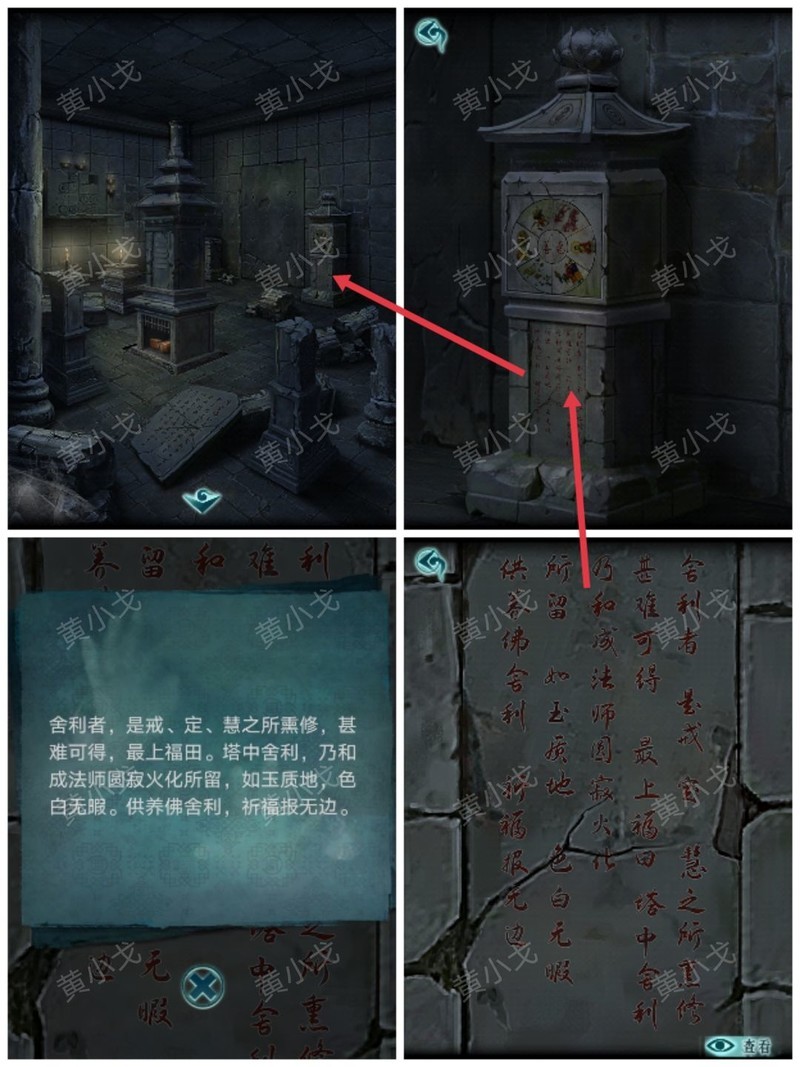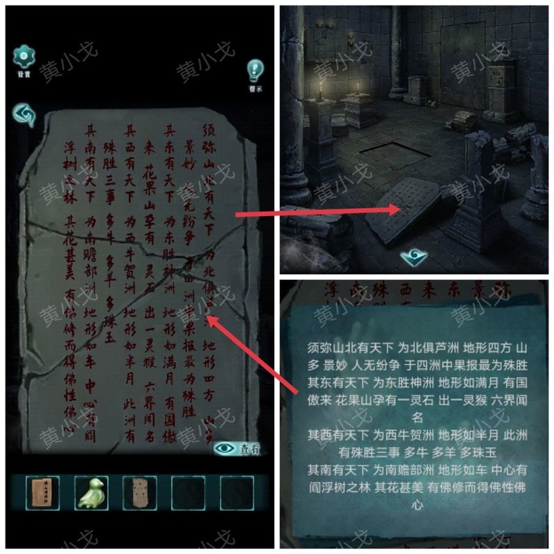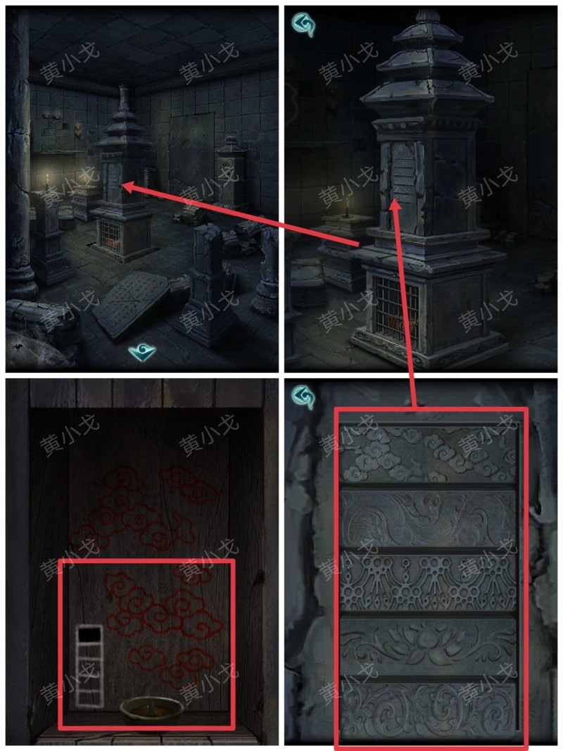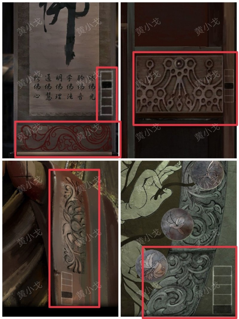 点击中央石柱的机关,依据各场景线索,调整相应花纹石块的位置。