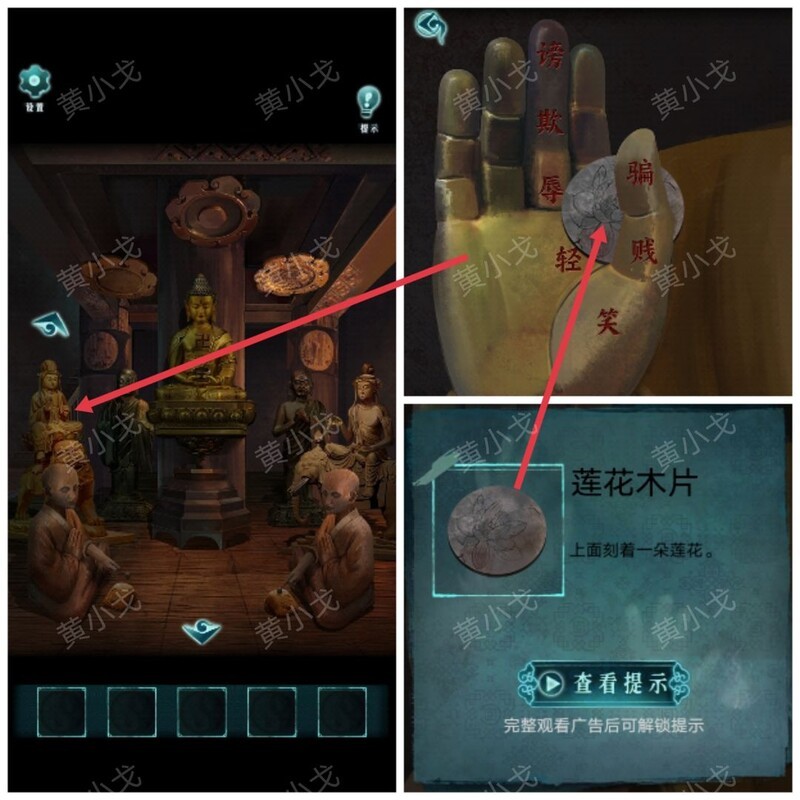 点击右侧阿弥陀佛像手中的机关,参照左侧药师佛像手上显示的字的位置,并结合墙上挂画提供的线索,调整滑块上的文字对应位置(谤对忍、欺对让、辱对避、笑对由、轻对耐、贱对敬、骗对漠)。
