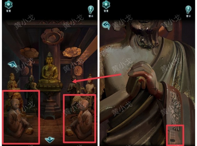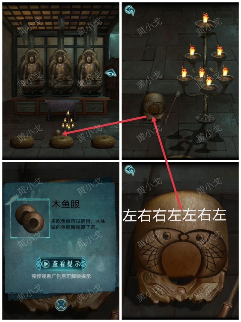 查看右后方佛像的涂鸦,留意两个雕像敲木鱼的顺序为左右右左左右左。