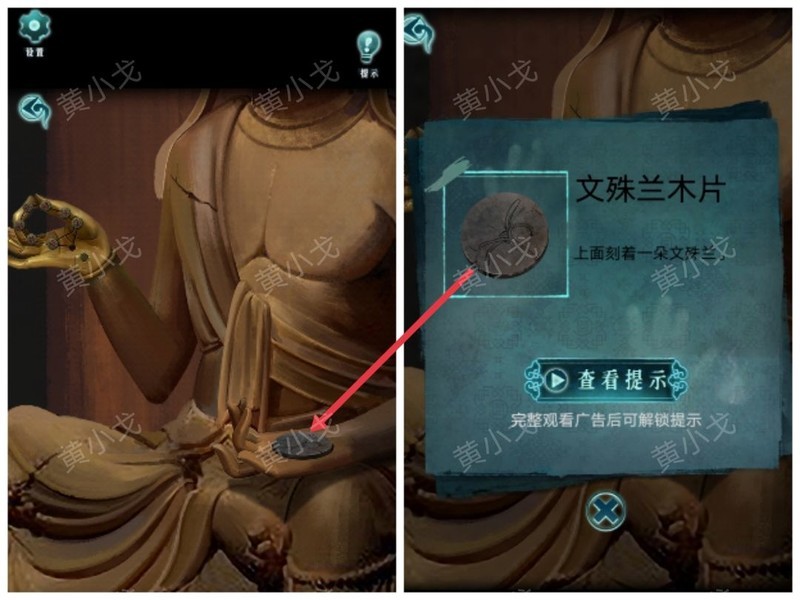 在一楼右侧点击左侧药师佛像,获取,注意菩萨像手上文字位置。
