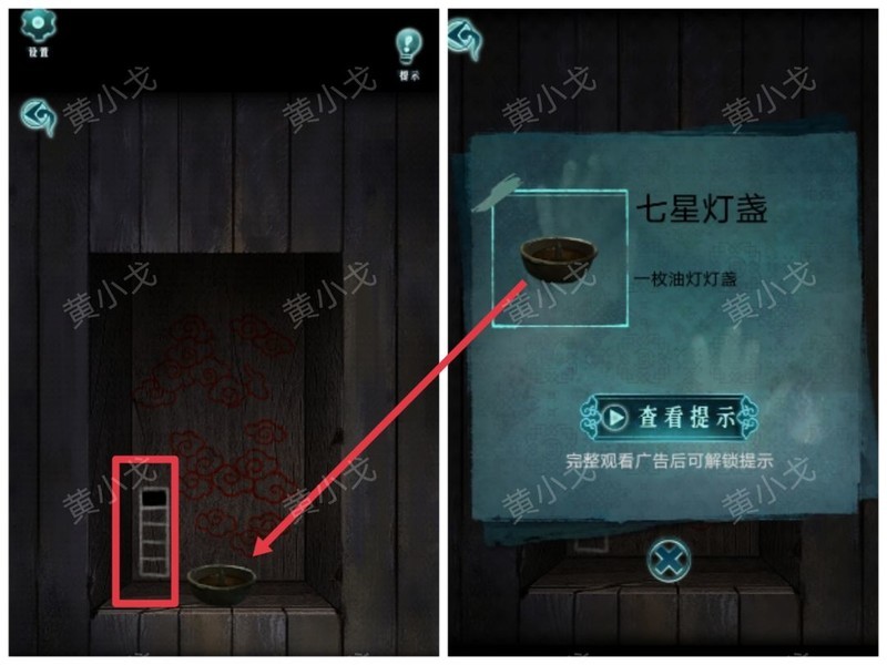 点击一楼左侧地面烛台,放入七星灯盏,用阳火点燃,触发剧情。