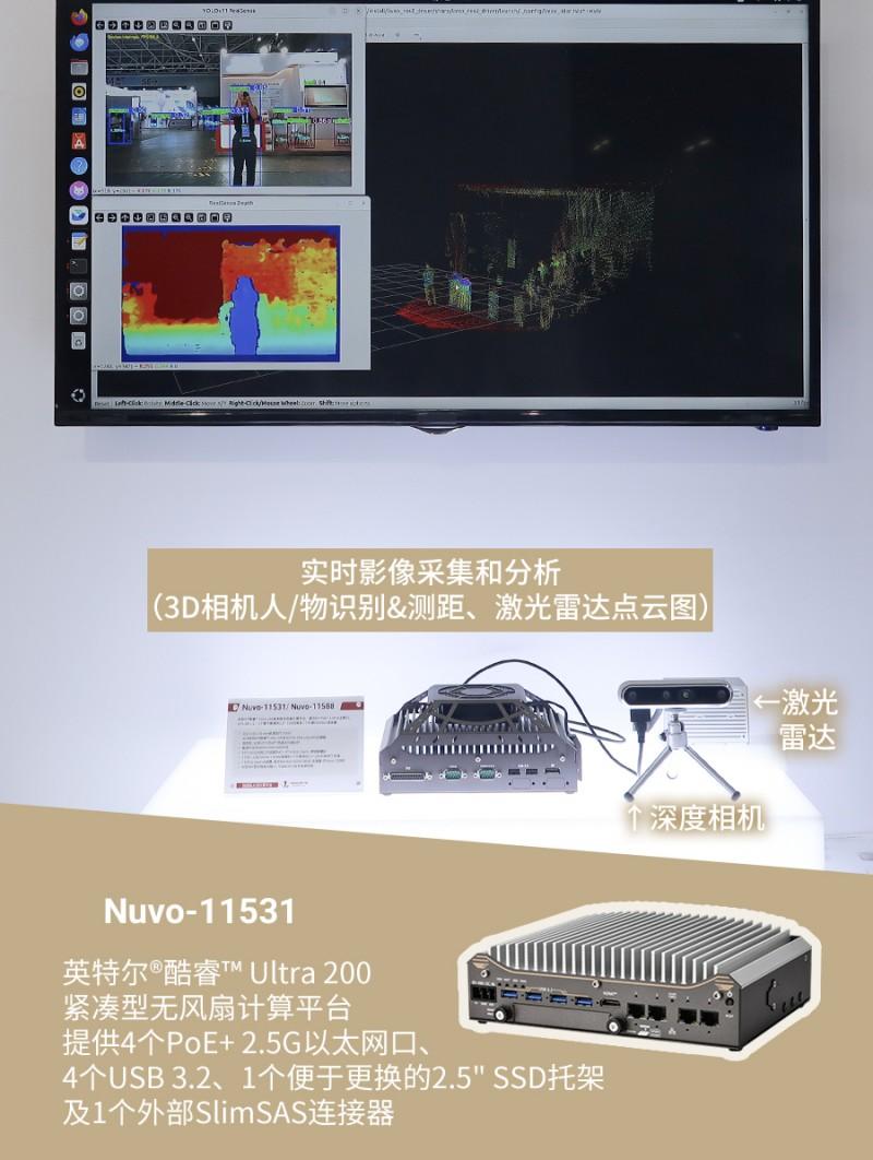 展台上,Nuvo-11531同时连接了立体视觉深度相机和激光雷达,实现了实时人物识别、测距及收集和呈现实时点云数据。