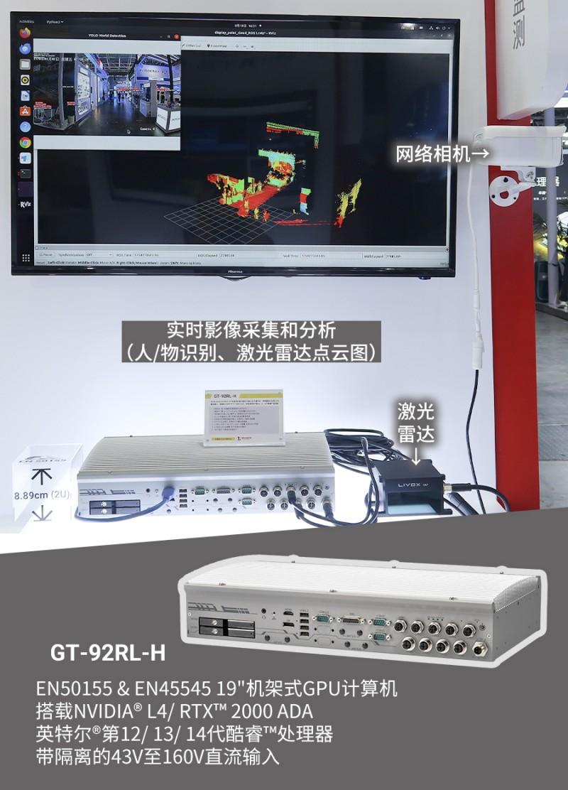 展台上,GT-92RL-H连接了一个IP相机和一个激光雷达,不仅可以对现场拍摄画面中的人和物进行实时识别,同时还能呈现激光雷达点云数据。
