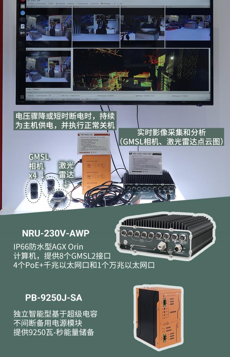 在现场,NRU-200-AWP同时连接了4个GMSL2相机和1个激光雷达,可以对相机拍摄的实时画面进行识别分析,同时还能对激光雷达采集的画面进行实时呈现和数据采集。同时,在NRU-200-AWP和电源之间搭载了基于超级电容的备用电源模块PB-9250J系列,以应对铁路环境电压不稳的情况。
