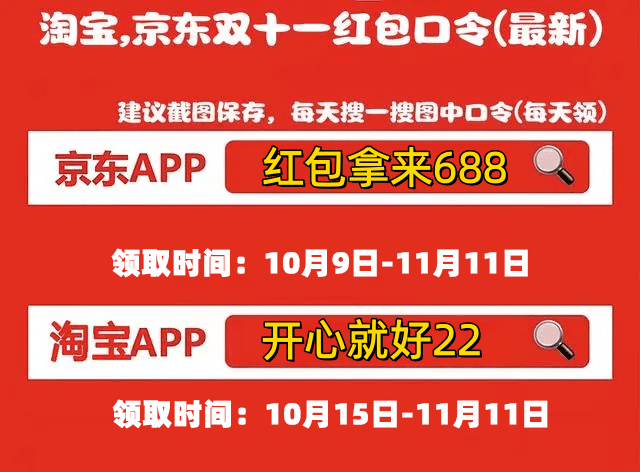 其实双十一不用搞得太复杂,记准两个红包口令(京东「红包拿来688」、淘宝「开心就好22」),抓对几个关键时间,避开小坑,就能轻松省钱。你今年双十一最想买什么?是刚需品还是囤货?