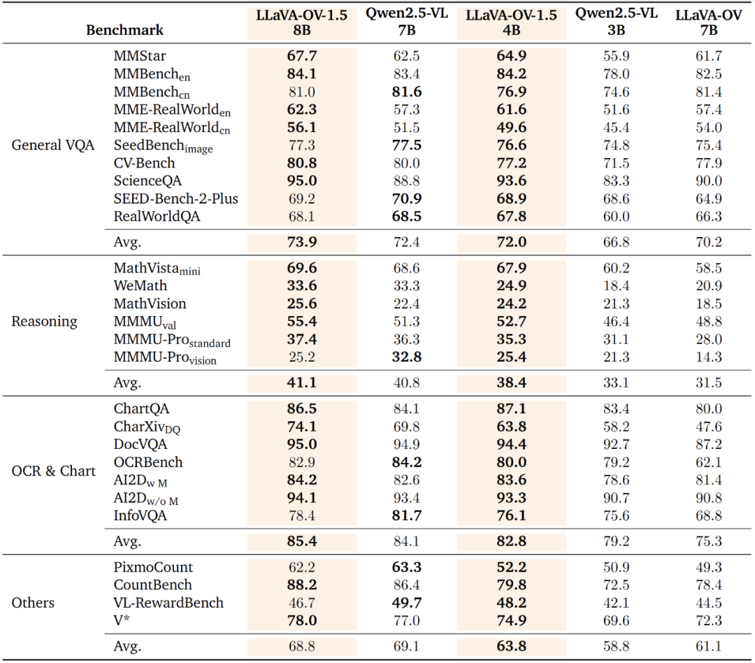 实验结果显示,LLaVA‑OneVision 在多项公开多模态基准上较 Qwen2.5‑VL 展现出竞争性乃至更优性能(详见技术报告)。