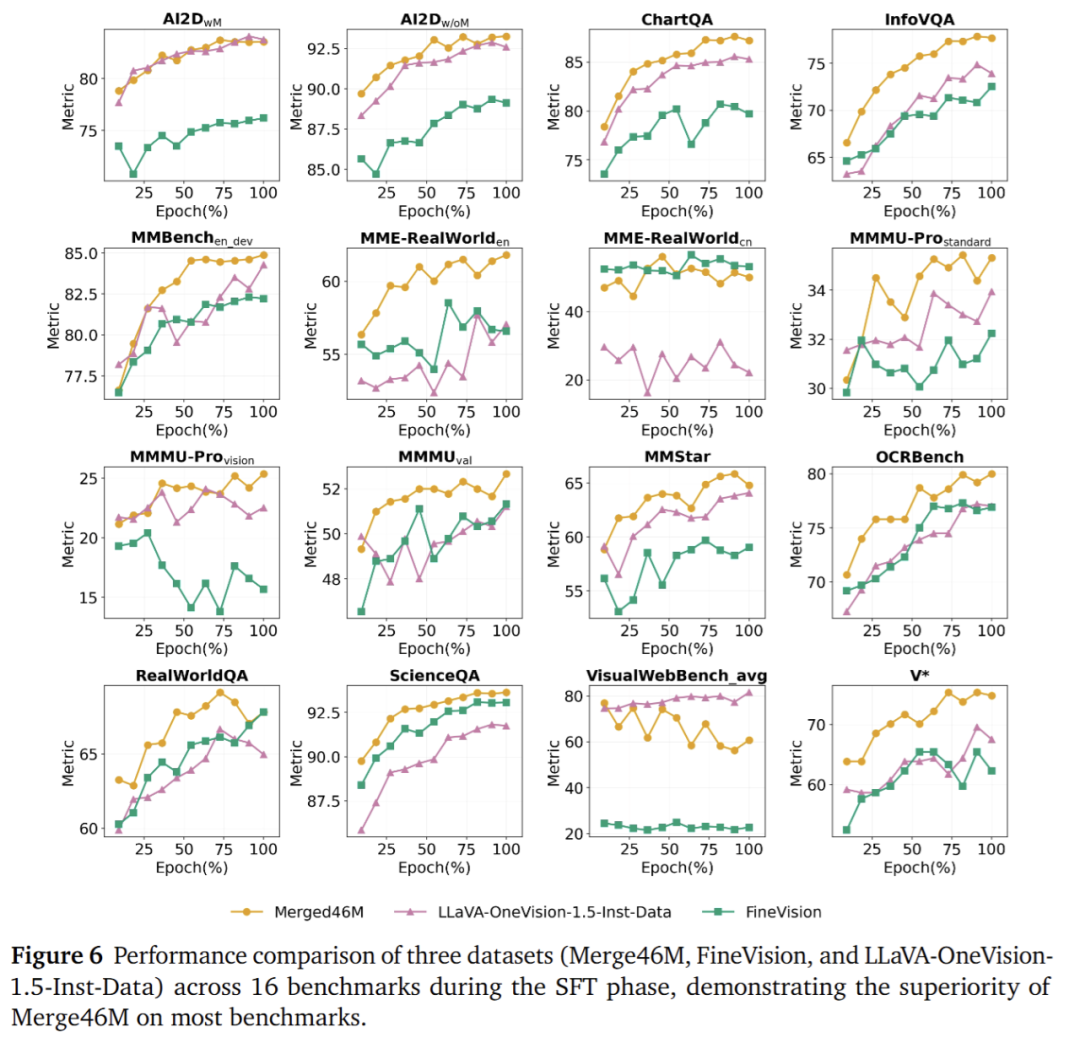 指令数据 22M 覆盖八大类别:Caption、Chart & Table、Code & Math、Domain-specific、General VQA、Grounding & Counting、OCR、Science。通过多源聚合、格式统一、指令重写、双语互转、模板去同质化与安全筛除,保持类别与难度分布均衡。并且我们的指令数据叠加 FineVision 数据集之后,结果会继续增加。