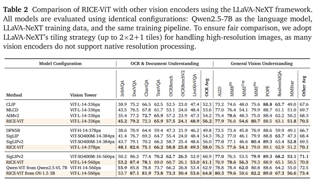 为了让模型在 OCR、表格 / 文档、区域理解与后续指令推理上具有更高的下限,我们在 LLaVA-OneVision-1.5 中采用自研的 MVT v1.5(RICE-ViT) 作为视觉主干。