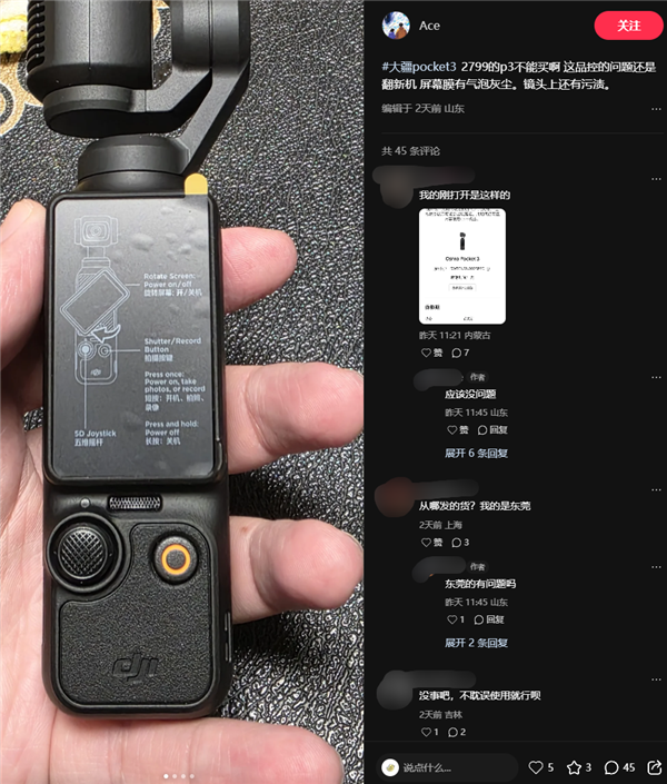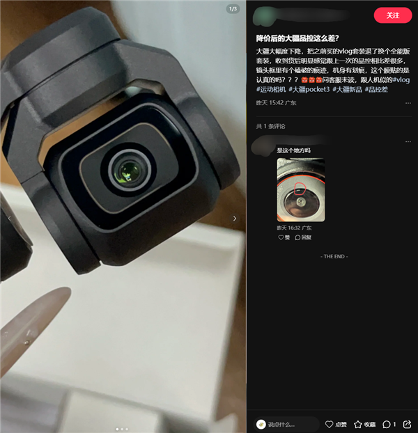 不过,不少消费者在小红书晒出降价后入手的Pocket 3,反映新机存在机身划痕、云台歪斜、屏幕贴膜气泡等问题,对大疆的品控提出质疑。