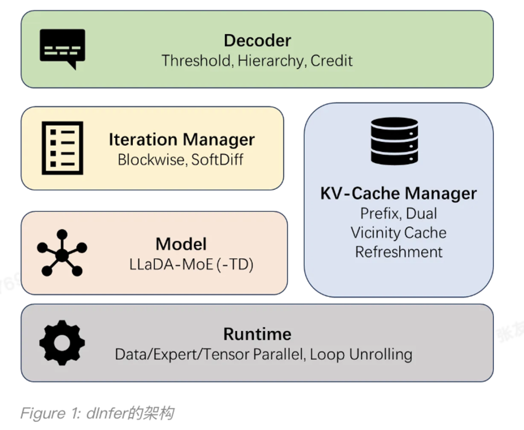 dInfer 的设计哲学是模块化与可扩展性,以系统性集成算法与系统优化。如下图所示,dInfer 包含四大核心模块:模型接入(Model)、KV 缓存管理器(KV-Cache Manager),扩散迭代管理器(Iteration Manager),和解码策略(Decoder)。