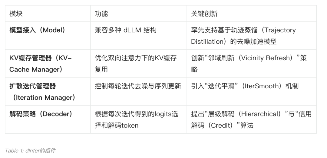 这种可插拔的架构,允许开发者像搭乐高一样,进一步组合和探索不同模块的优化策略,并在统一的平台上进行标准化评测 。更重要的是,dInfer 针对上述三大挑战,在每个模块中都集成了针对性的解决方案。